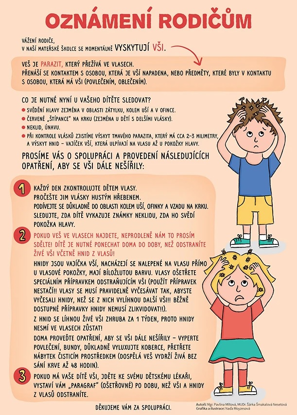 Vážení rodiče, ve školce se nám vyskytly vši. Proto Vás prosíme o důkladnou kontrolu vlasů Vašich dětí a přijetí vhodných opatření proti případnému šíření tohoto parazita.