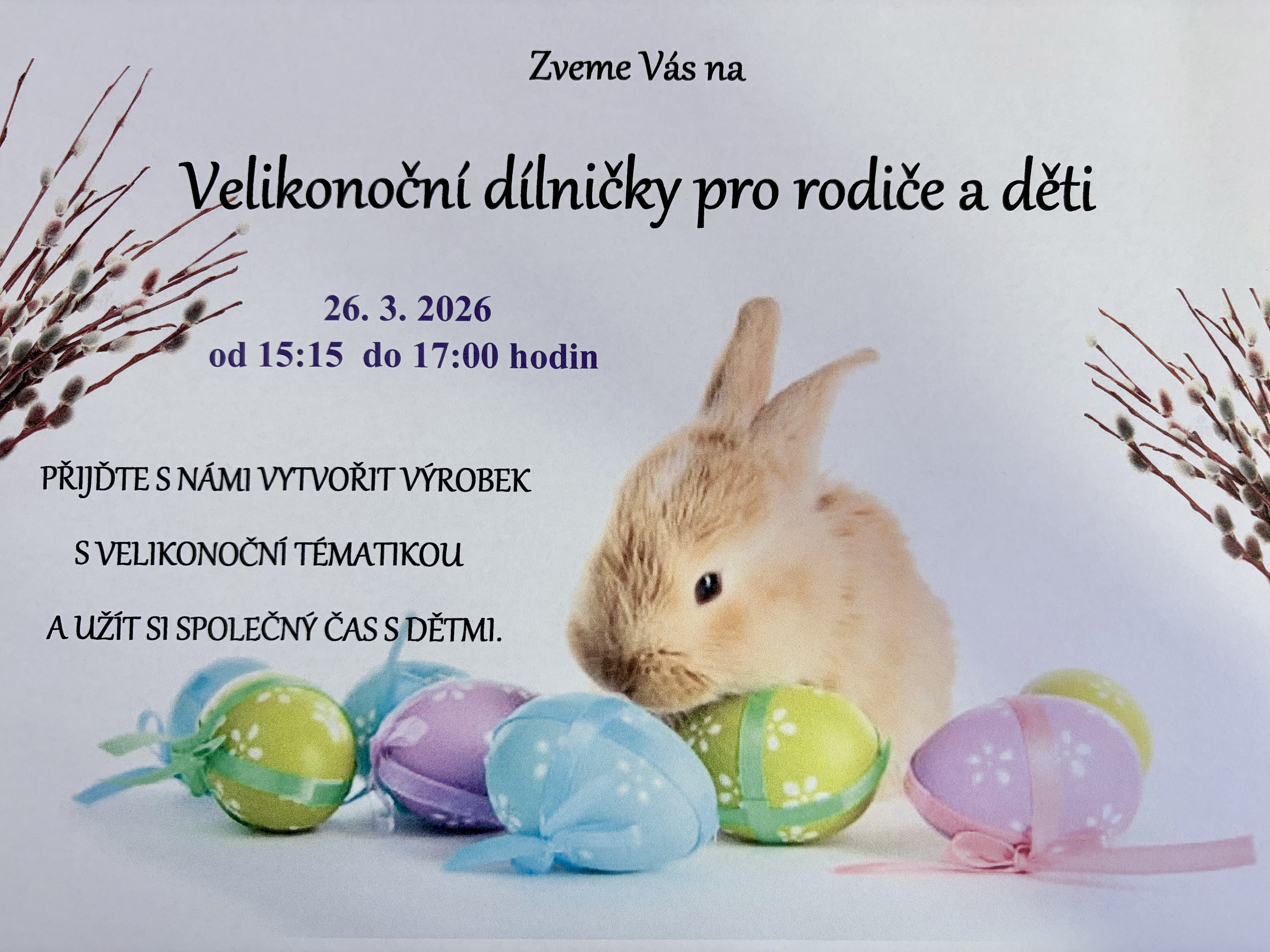 Ve středu 26. 3. 2026 proběhnou od 15:15 do 17:00 hodin VELIKONOČNÍ DÍLNIČKY pro rodiče a děti.