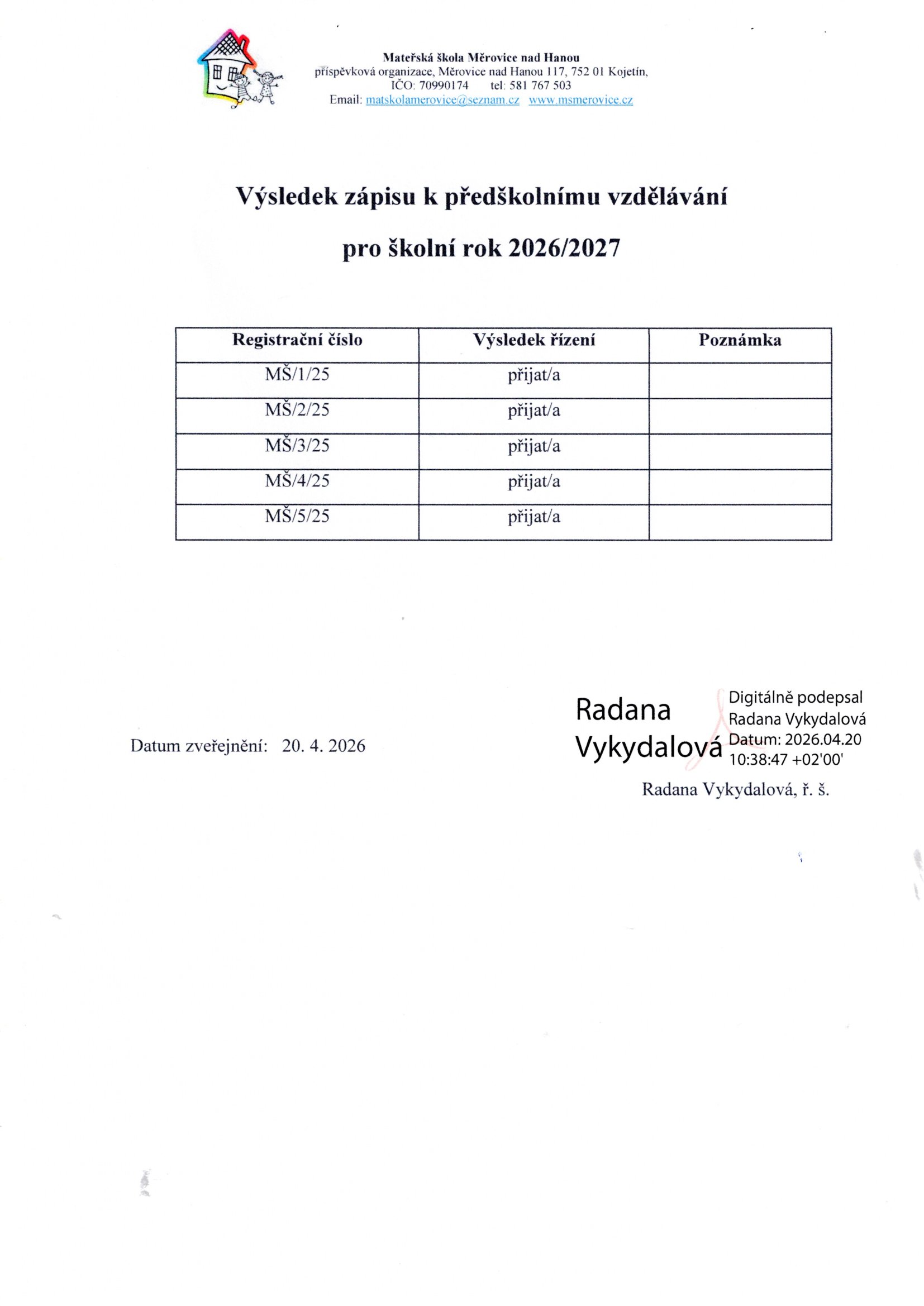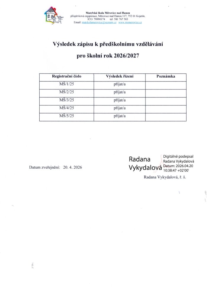 Seznam přijatých dětem gratulujeme a budeme se těšit 1. 9. 2026